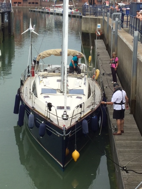Some of our small band of well wishers…. Bridget, Ann, Ros and Margaret on the lockside as Poli Poli entered the lock at Sovereign Harbour.