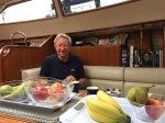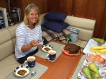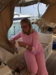 Oops…. the welcome party…. note the red arrows on the banner made by Richard. the next photo shows Poli Poli reversing into her berth at North Harbour where lots more family and froends were waiting. Here Christine and Jonathan are assisting Mike with the docking lines.
